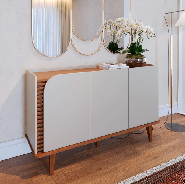Esse Aparador Buffet com 03 Portas é a combinação perfeita do design retrô e contemporâneo. Os pés de madeira maciça e linhas orgânicas evidenciam isso, ao passo que os apliques ripados destacam a porta de quina usinada. Perfeito para a organização de louças e demais itens de jantar.