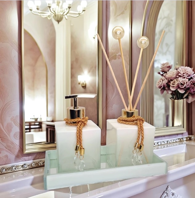 Kit de Luxo Decorativo em Vidro com Saboneteira, Difusor de Aroma , Bandeja para Lavabo e Banheiro.
